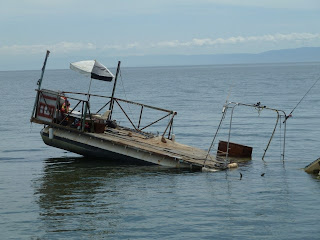 At one point, the salvager jumped up and down on the dry end of the salvage boat, perhaps to shake something loose, but failing at his attempt, abandoned the salvage effort for the time being and went ashore on his rubber raft.